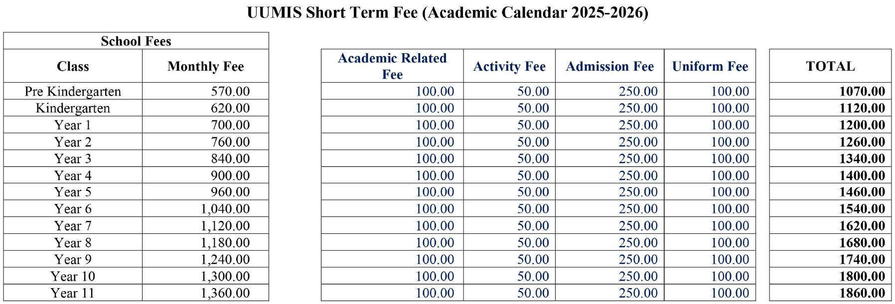 **ONE OFF FEE – ADMISSION FEE (RM 250) & UNIFORM FEE (RM 250)**